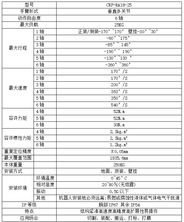 功能特点: 1.机器⼈整体结构⾼度紧凑、轻量化,更加轻巧适⽤,尤其腕部更加⼩巧,满⾜更多的场景。 2.机器⼈刚性⾼,采⽤⾼速电机,节拍更快。 3.机器⼈电机采⽤密封设计,防护等级⾼达IP67,适应更恶劣的应⽤环境。 4.J2J3J4轴上都预留安装孔位,⽅便安装固定电磁阀以及其他配件等。J3轴位置提供⽤户IO接⼝以及双 回路⽓管,更加满⾜搬运应⽤。 5.驱动采⽤全新的PID控制,前瞻技术,快速响应;观测器动态补偿,弱磁功能,电机控制更好、更稳、转速更⾼。 6.全新的控制算法,运动学与动⼒学结合。全新的设计、驱动算法、控制算法融为⼀体,根据机械部件特性,负载情况,实现⾃动规划,保证机械寿命的同时机器⼈在允许的最⼤能⼒范围⼯作,机器⼈寿 命更⻓久,机器⼈实现⾼速响应,运⾏速度更快、更柔、更稳,⼯作节拍更快。 7.具有碰撞检测功能,更好的保护机器⼈本体以及外围设备;具有重⼒补偿功能,机器⼈精度更⾼,满⾜更⾼精度的场景应⽤,拓宽应⽤场景。 8.配置独⽴于控制系统的安全急停板,采⽤强制型断开继电器,对外提供双回路急停,确保急停的可靠性。 9.内装三相变压器,380V和220V进⾏隔离,电源更稳定。内装三相滤波器,有效隔离外部⼲扰和防⽌内部⼲扰输出。 本体技术指标: |