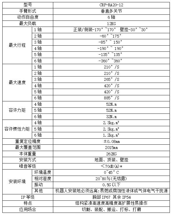 功能特点: 1.机器⼈整体结构⾼度紧凑、轻量化,更加轻巧适⽤,尤其腕部更加⼩巧,满⾜更多的场景。 2.机器⼈刚性⾼,采⽤⾼速电机,节拍更快。 3.机器⼈电机采⽤密封设计,防护等级⾼达IP67,适应更恶劣的应⽤环境。 4.J2J3J4轴上都预留安装孔位,⽅便安装固定电磁阀以及其他配件等。J3轴位置提供⽤户IO接⼝以及双回路⽓管,更加满⾜搬运应⽤。 5.驱动采⽤全新的PID控制,前瞻技术,快速响应;观测器动态补偿,弱磁功能,电机控制更好、更稳、转速更⾼。 6.全新的控制算法,运动学与动⼒学结合。全新的设计、驱动算法、控制算法融为⼀体,根据机械部件特性,负载情 况,实现⾃动规划,保证机械寿命的同时机器⼈在允许的最⼤能⼒范围⼯作,机器⼈寿命更⻓久,机器⼈实现⾼速 响应,运⾏速度更快、更柔、更稳,⼯作节拍更快。 7.具有碰撞检测功能,更好的保护机器⼈本体以及外围设备;具有重⼒补偿功能,机器⼈精度更⾼,满⾜更⾼精度的 场景应⽤,拓宽应⽤场景。 8.配置独⽴于控制系统的安全急停板,采⽤强制型断开继电器,对外提供双回路急停,确保急停的可靠性。 9.内装三相变压器,380V和220V进⾏隔离,电源更稳定。内装三相滤波器,有效隔离外部⼲扰和防⽌内部⼲扰输出。