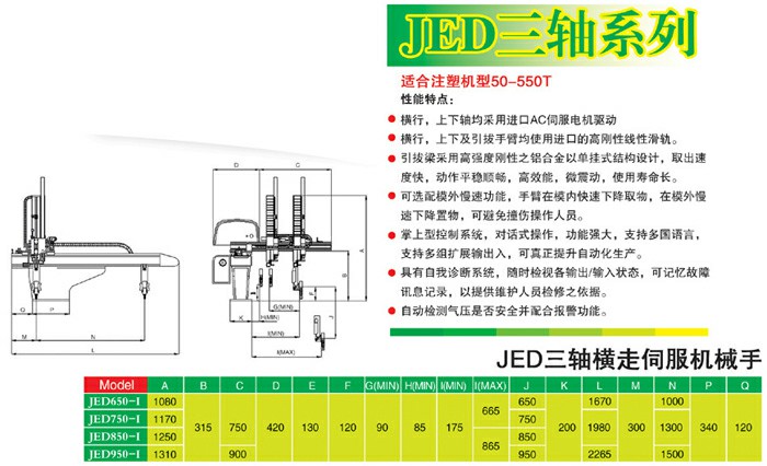 名称:JED三轴机械手 说明: JED三轴机械手主要由手部、运动机构和控制系统三大部分组成。手部是用来抓持工件(或工具)的部件,注塑流水线设备根据被抓持物件的形状、尺寸、重量、材料和作业要求而有多种结构形式,注塑流水线设备如夹持型、托持型和吸附型等。运动机构,JED三轴机械手使手部完成各种转动(摆动)、移动或复合运动来实现规定的动作、JED三轴机械手改变被抓持物件的位置和姿势。运动机构的升降、伸缩、旋转等独立运动方式,JED三轴机械手称为机械手的自由度。注塑流水线设备为了抓取空间中任意位置和方位的物体,需有6个自由度。自由度是机械手设计的关键参数越多、自由度越多,JED三轴机械手的灵活性越大,注塑流水线设备,注塑机械手厂家通用性越广,其结构也越复杂。 上一页:JEM三轴机械手 下一页:JED两轴机械手 [返回]