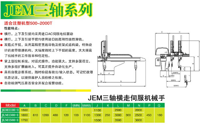 名称:JEM三轴机械手 说明: 采用JEM三轴机械手不仅可以提高产品质量,更可以节省人工,提高生产效率。 1牢靠性高.使用人手进到模内取产品,JEM三轴机械手如果机器故障或误按键造成合模,注塑流水线设备有夹伤工人手之危险,使用机械手确保牢靠。 2.节省人工. JEM三轴机械手取出产品放置在输送带或承接台上,只需一人同时看两台甚至更多台,可节省人工,JEM三轴机械手做成自动流水线更能节省厂地,所以整厂规划更小更紧凑。 3.注塑流水线设备提高品质和效率. 4.延长机器的使用寿命.人员取出产品需要频繁的开关门,JEM三轴机械手会造成机床某些部件寿命减短甚至损坏,影响生产。注塑流水线设备使用机械手则不需要频繁的开关门。 上一页:机械手 下一页:JED三轴机械手 [返回]