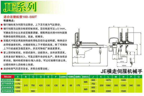 名称:JE横走伺服机械手 说明: JE横走伺服机械手主要由执行机构、驱动机构和控制系统三大部分组成。手部是用来抓持工件(或工具)的部件,注塑流水线设备根据被抓持物件的形状、尺寸、重量、材料和作业要求而有多种结构形式,注塑流水线设备如夹持型、托持型和吸附型等。运动机构,JE横走伺服机械手使手部完成各种转动(摆动)、移动或复合运动来实现规定的动作,注塑流水线设备改变被抓持物件的位置和姿势。JE横走伺服机械手运动机构的升降、伸缩、旋转等独立运动方式,称为机械手的自由度。JE横走伺服机械手为了抓取空间中任意位置和方位的物体,注塑流水线设备需有6个自由度。自由度是机械手设计的关键参数。JE横走伺服机械手自由度越多,机械手的灵活性越大,通用性越广,其结构也越复杂。一般专用机械手有2~3个自由度。 上一页:横走伺服机械手 下一页:JEM机械手 [返回]