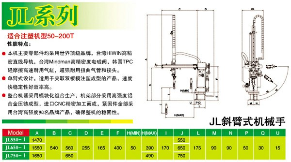 名称:JL斜臂式机械手 说明: JL斜臂式机械手的种类,按驱动方式可分为液压式、气动式、电动式、机械式机械手;按适用范围可分为专用机械手和通用机械手两种;按运动轨迹控制方式可分为点位控制和连续轨迹控制机械手等。JL斜臂式机械手通常用作机床或其他机器的附加装置,如在自动机床或自动生产线上装卸和传递工件,在加工中心中更换刀具等,JL斜臂式机械手一般没有独立的控制装置。有些操作装置需要由人直接操纵,JL斜臂式机械手如用于原子能部门操持危险物品的主从式操作手也常称为机械手。JL斜臂式机械手在锻造工业中的应用能进一步发展锻造设备的生产能力,改善热、累等劳动条件。 上一页:JL斜臂式双臂机械手 下一页:JF立式注塑机专用机械手 [返回]
