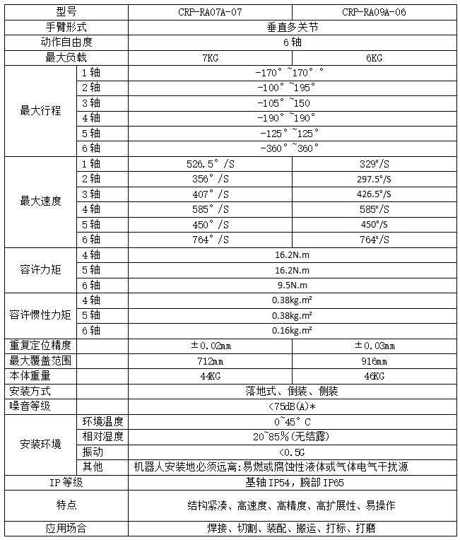 名称:工业机器人搬运用途 说明: 功能特点: 1.采用模块化设计,有效降低整机的故障率。 2.极精设计,方便在狭小的空间使用。 3.臂长712/916mm,手腕负载容量大,额定负载7Kg/6Kg,可轻松应对多种应用场合。 4.较同级别机器更轻的结构设计,容易安装在应用方案内部或者倒立安装。 5.采用高刚性手臂和尖端伺服控制技术,实现高速稳定且平滑的动作性能。 6.采用本体线缆内置技术,同时为客户提供外置走线固定座,以满足客户定制化需求。 7.采用全机体密封结构。 8.高扩展性,在机器人本体上设置有用户安装平台,便于用户安装固定线缆及相关辅助工装冶具。 本体技术指标: 上一页:PCB板机器人 下一页:工业机器人搬运用途 [返回]
